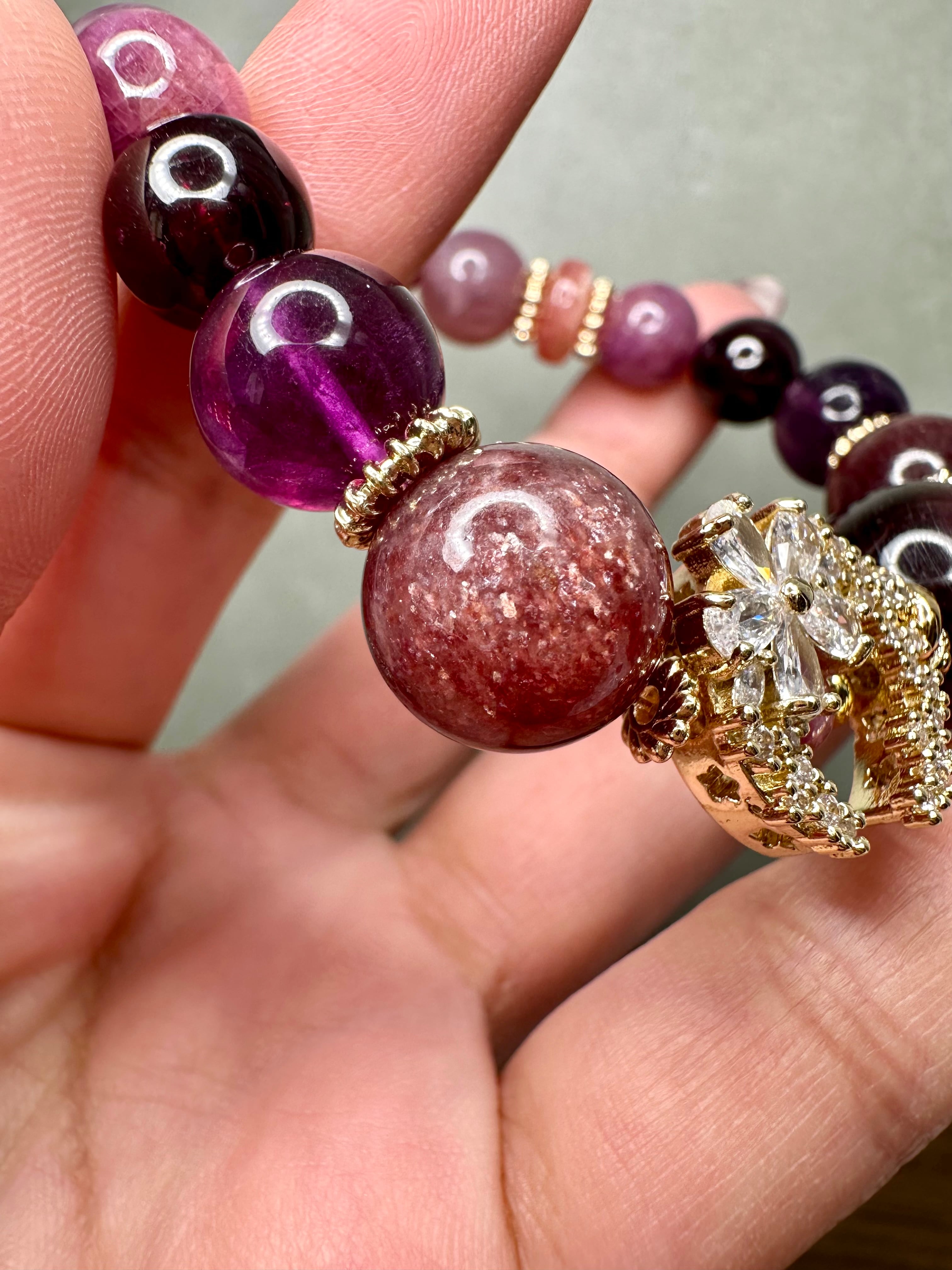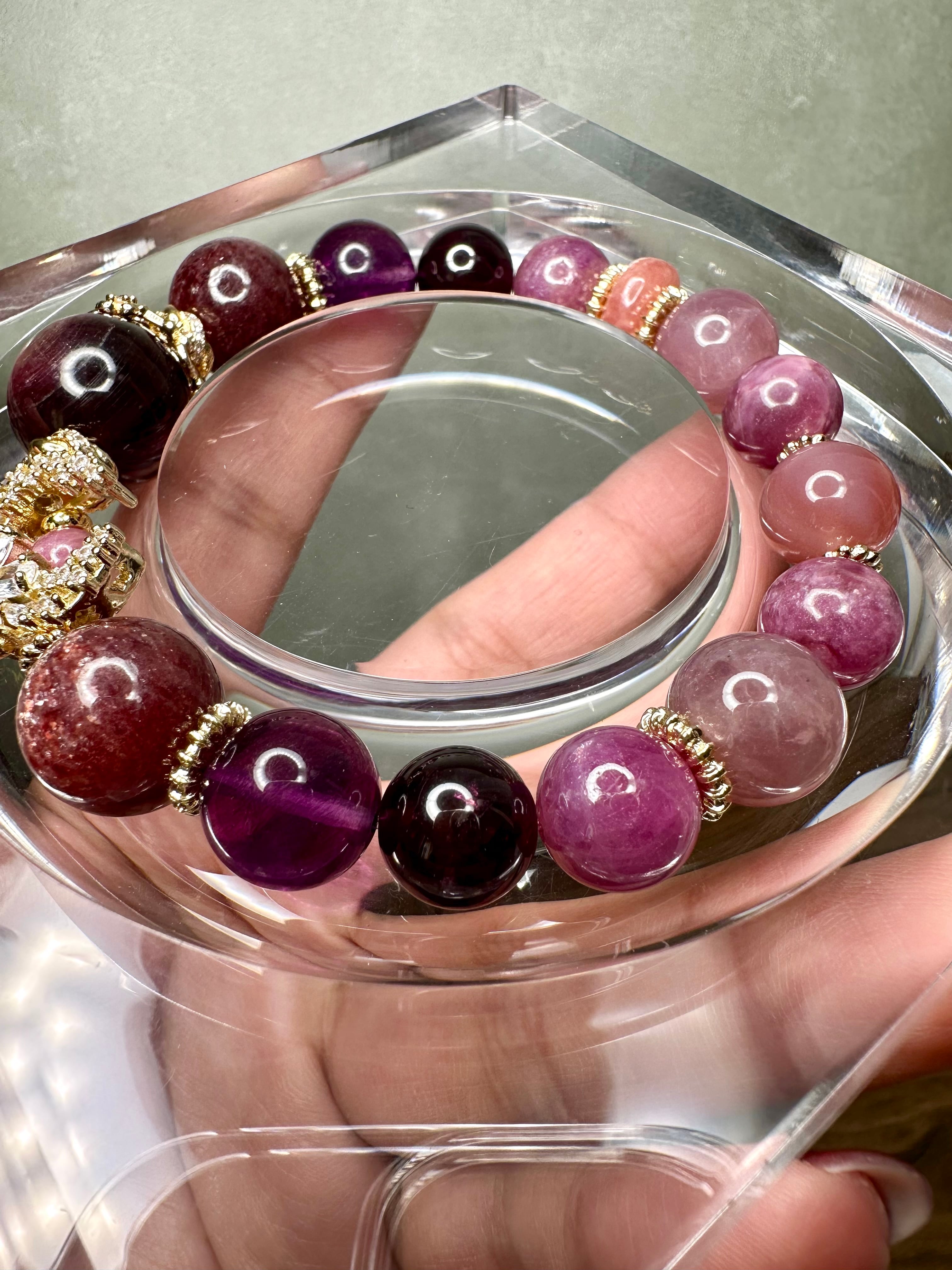パープルマイカ×マイカインストロベリークォーツ×ピンクパープルフローライト×ロードライトガーネット×ルビー×ディープローズクォーツ×レピドライト×塩源瑪瑙