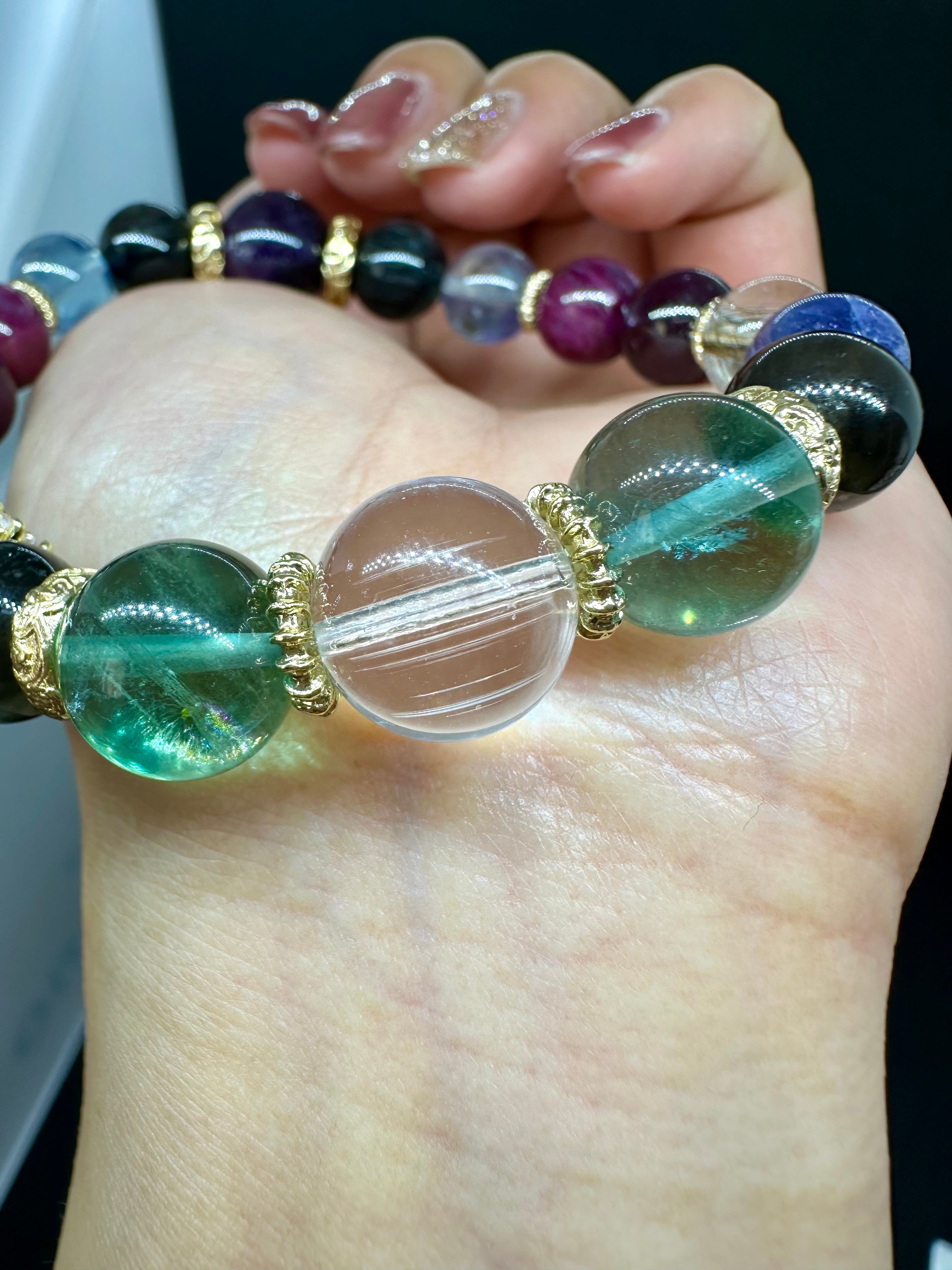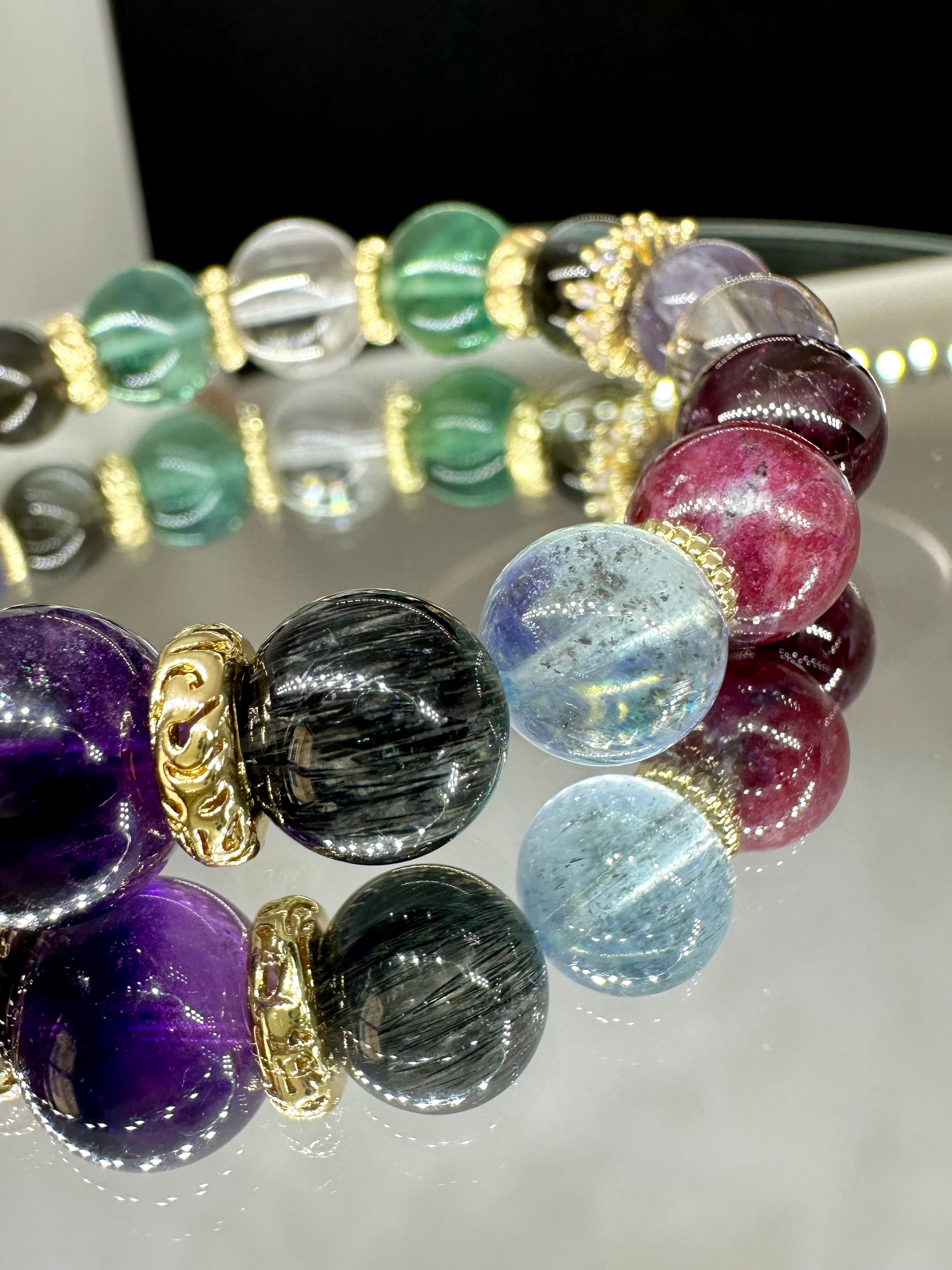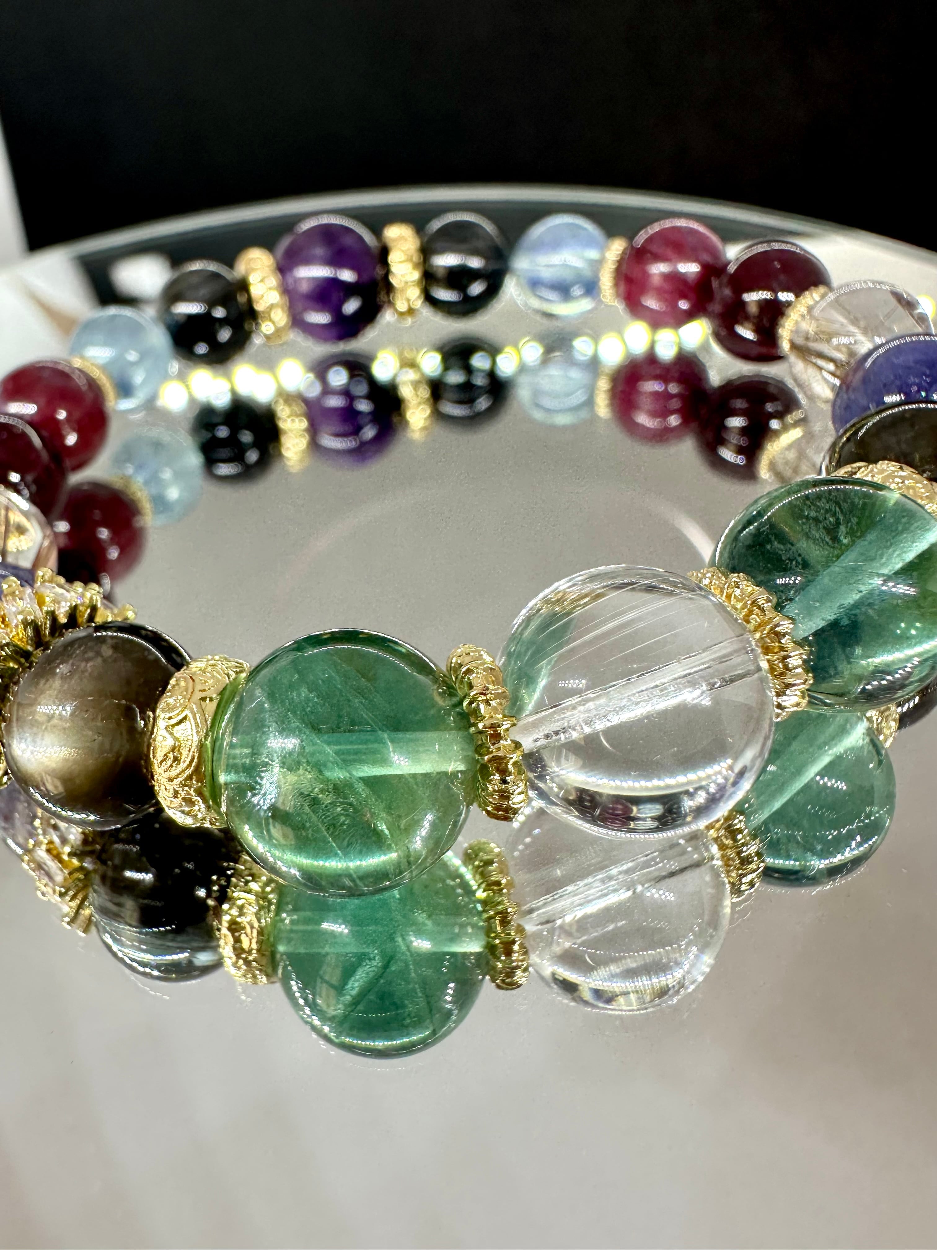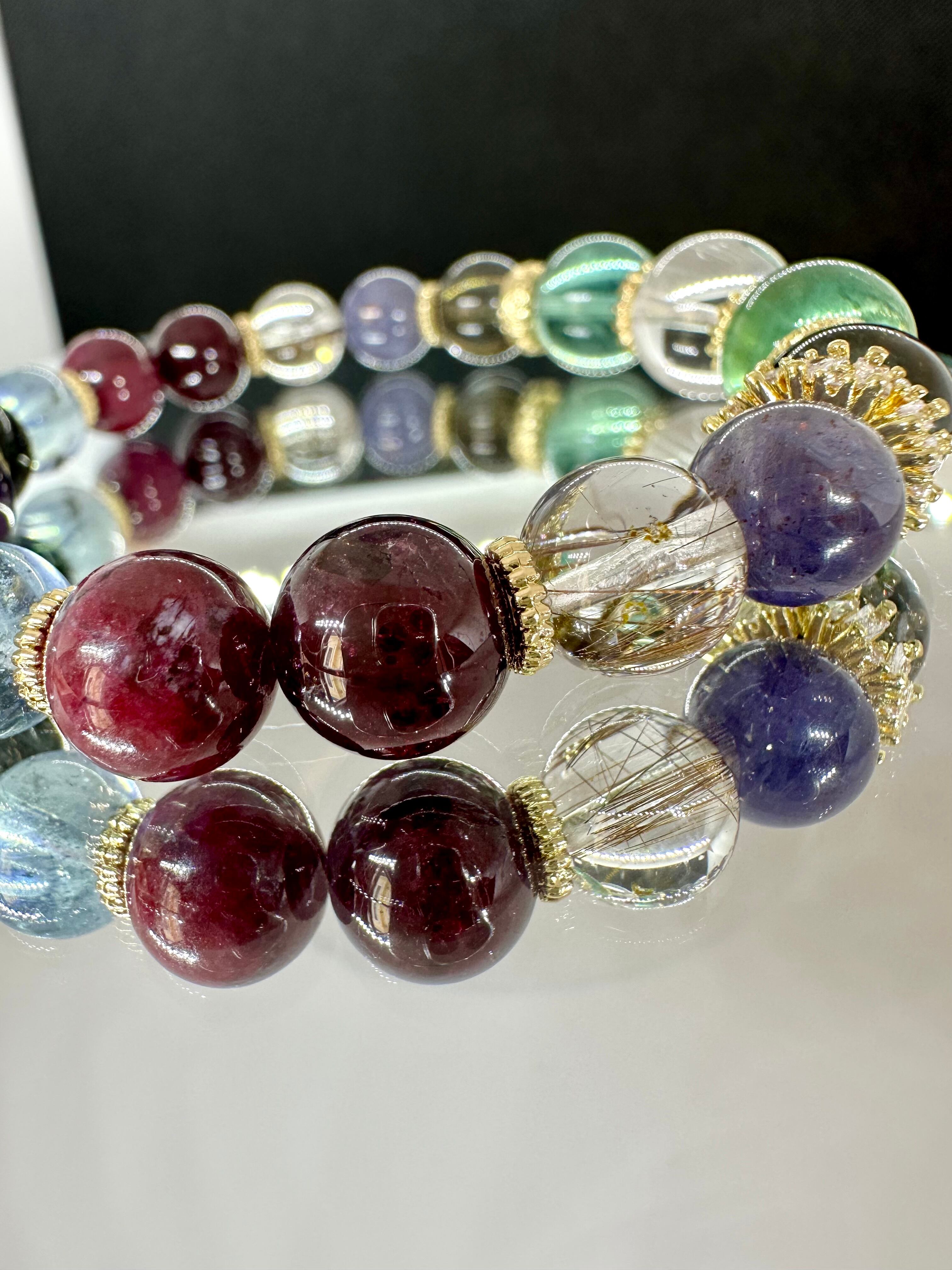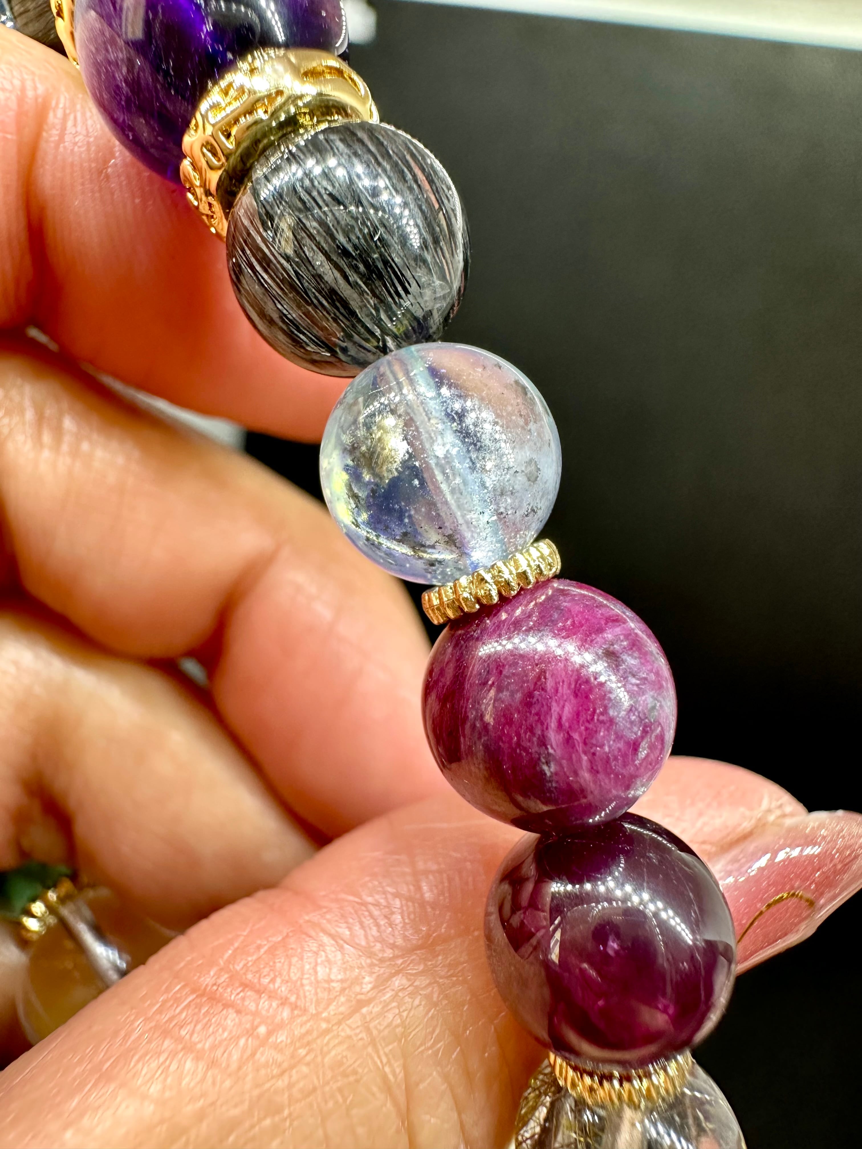 ニードルイントパーズ×アイリスフローライト×ブラックアクアマリン×ブラッドショットアイオライト×シルバールチルクォーツ×ロードライトガーネット×ルビー×モスアクアマリン×ブラックルチルクォーツ×エレスチャルアメジスト