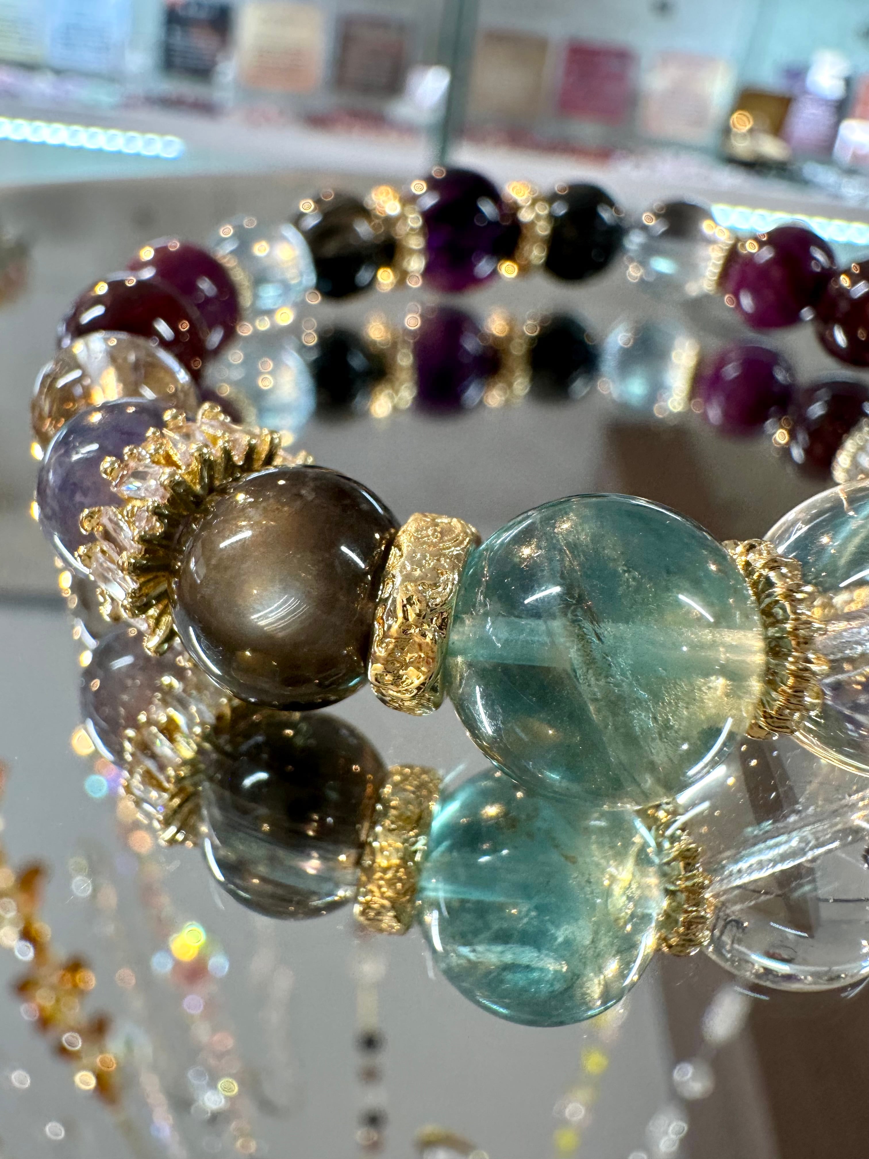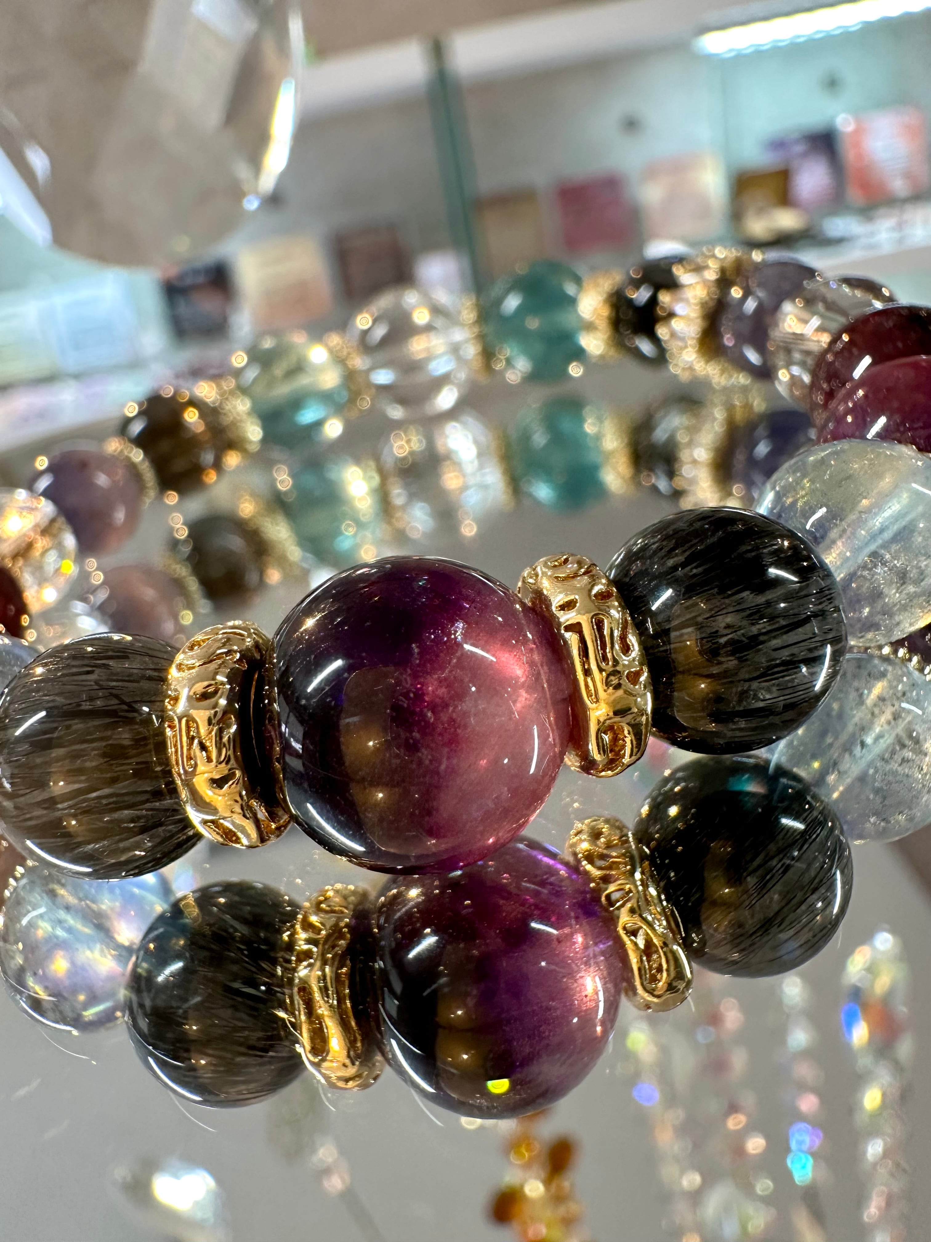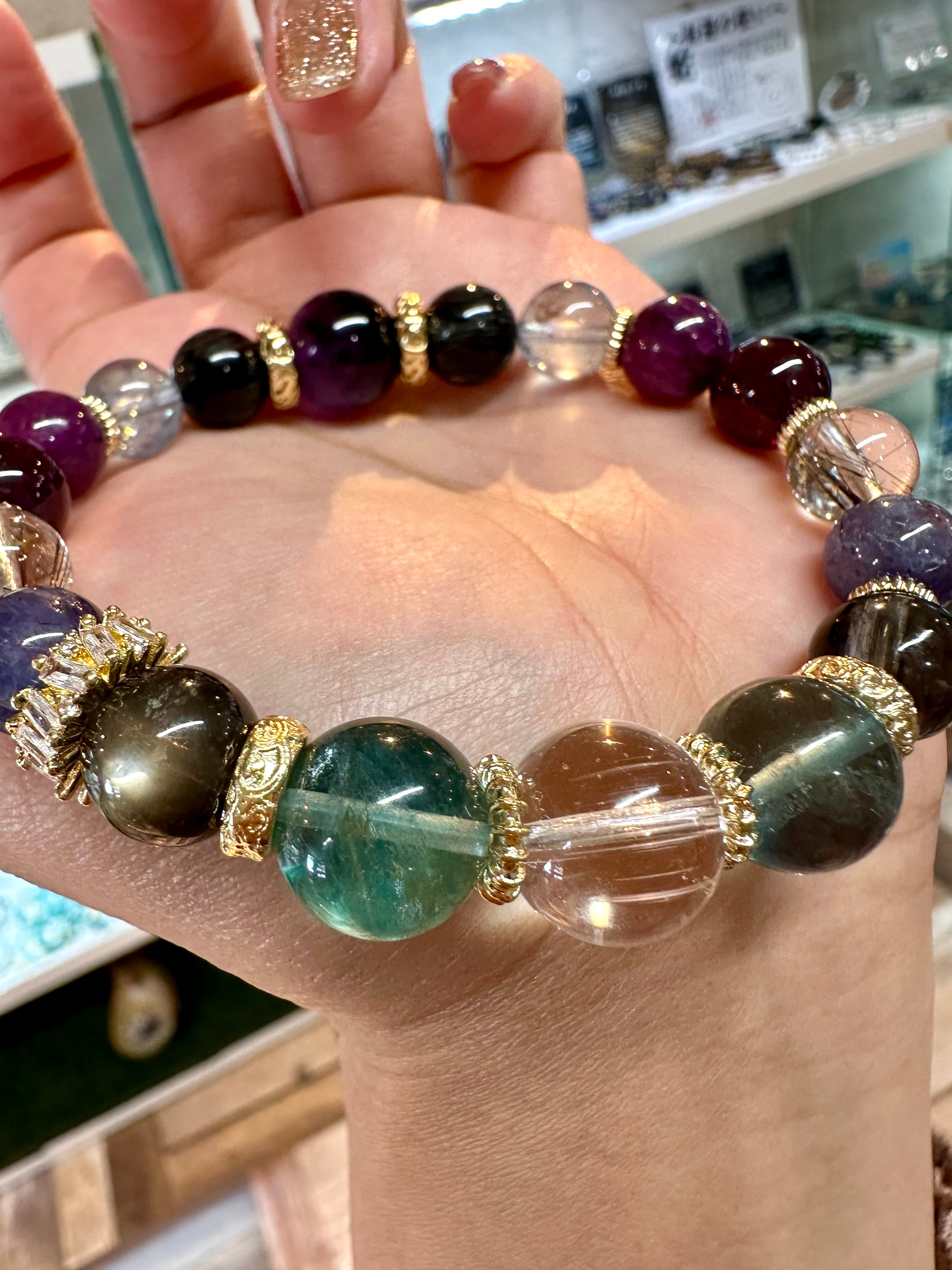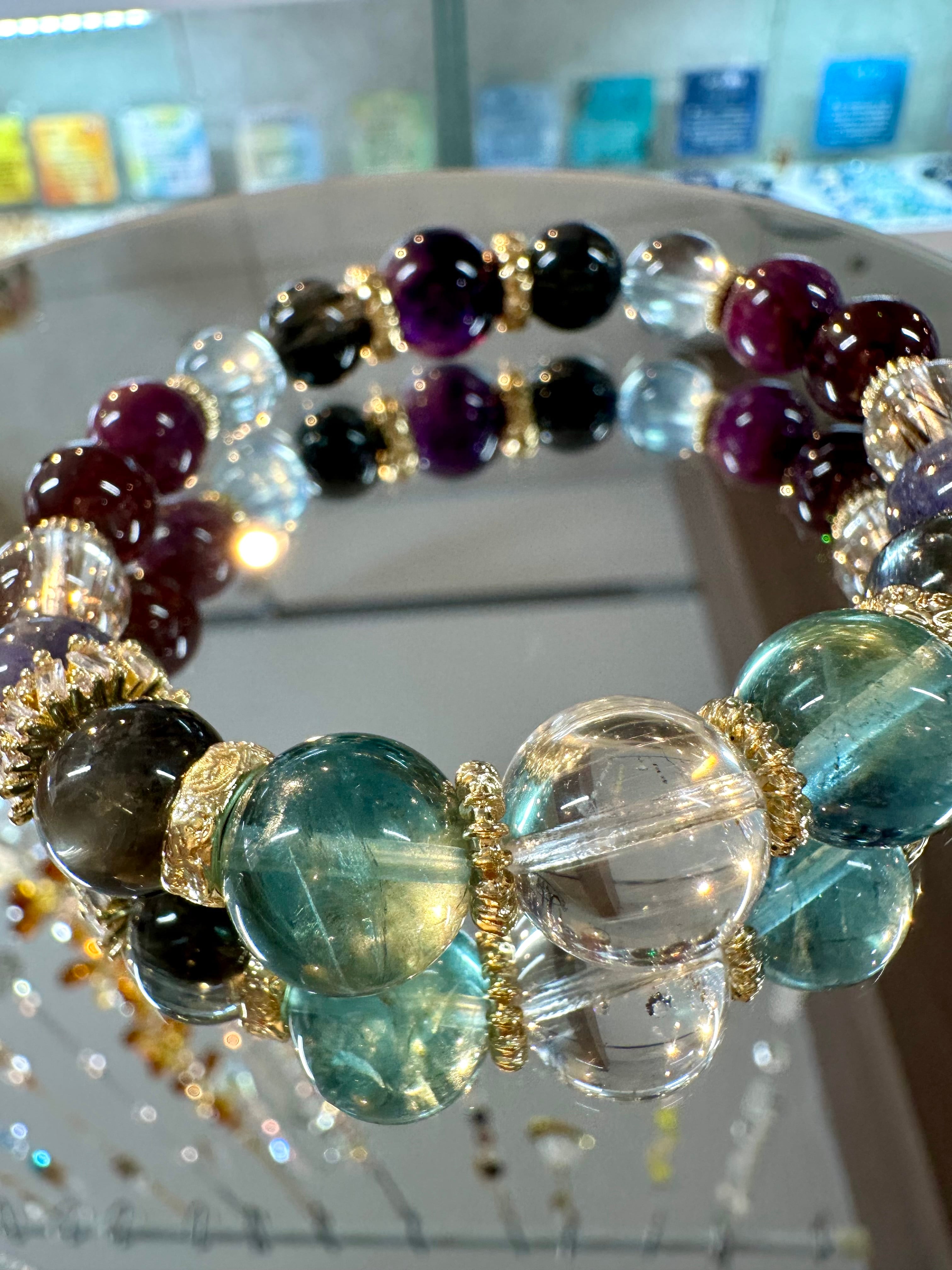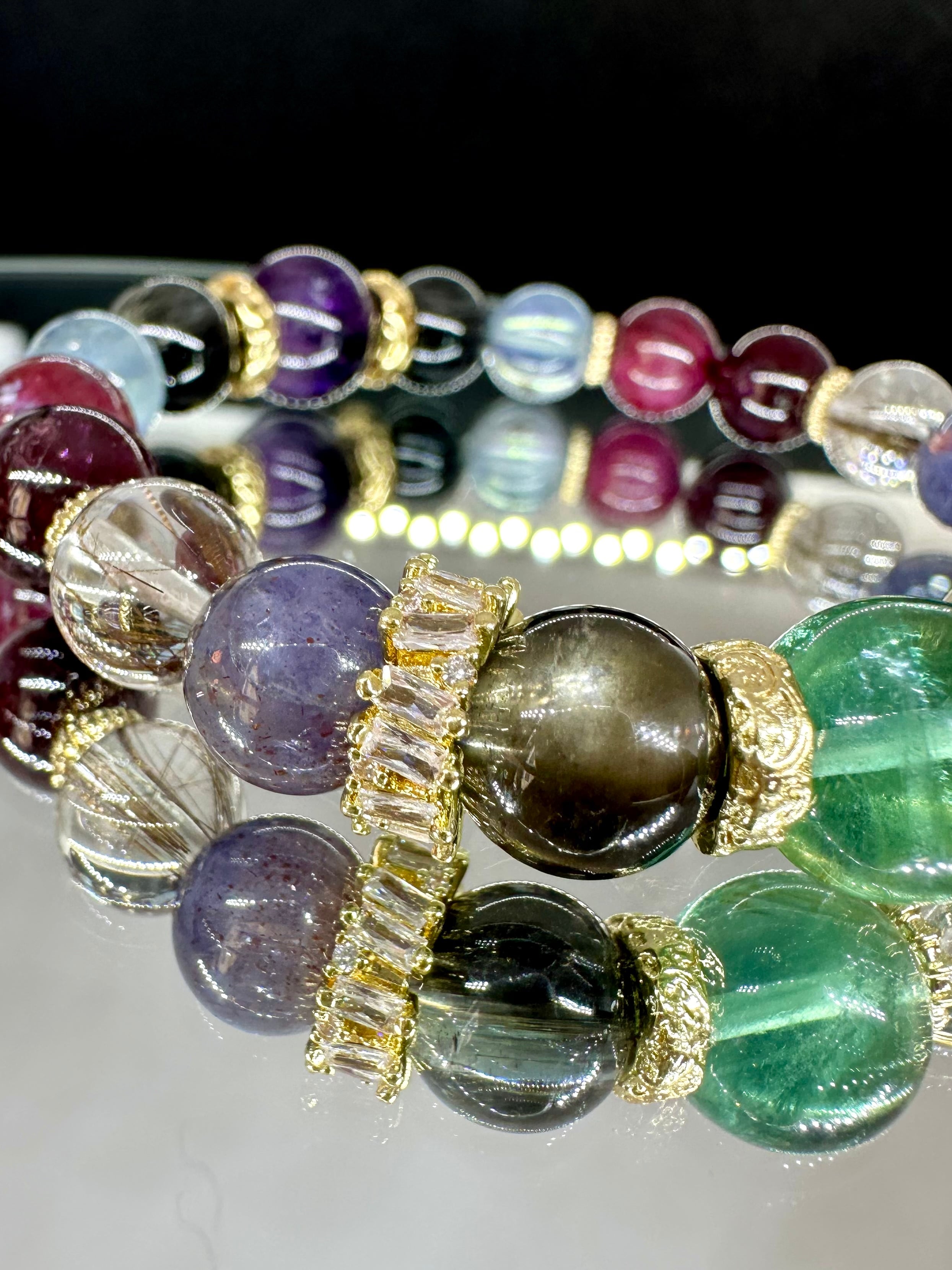 ニードルイントパーズ×アイリスフローライト×ブラックアクアマリン×ブラッドショットアイオライト×シルバールチルクォーツ×ロードライトガーネット×ルビー×モスアクアマリン×ブラックルチルクォーツ×エレスチャルアメジスト