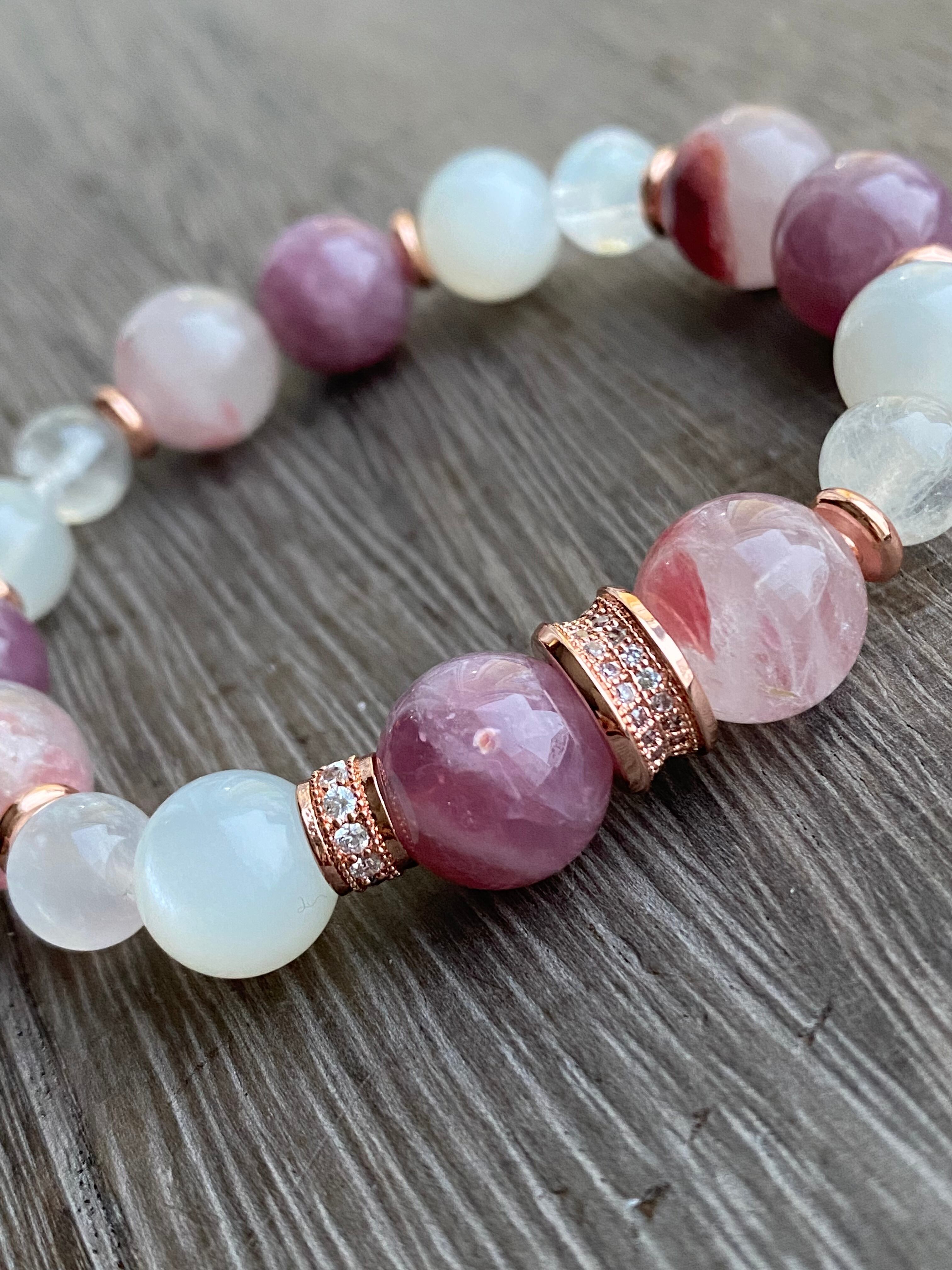 ラズベリーローズクォーツ×ロードナイトシリカ×ホワイトムーンストーン×レインボームーンストーン